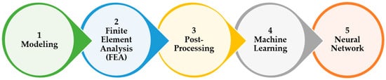 The overall approach is illustrated in Figure 2. The first step involved modeling a pneumatic actuator using digital engineering tools. The second step involved finite element analysis (FEA) of the model by using the material properties of Ninjaflex™ and a hyper-elastic Mooney–Rivlin model, along with necessary boundary conditions and loading cases. The third step was the postprocessing of the FEA results to simulate and trace the end position of the soft robot in response to varying pressure inputs of the model. We used the 3DEXPERIENCE® software platform for all modeling and simulation. The fourth step involved a neural network trained as a forward kinematic model of the actuator using MATLAB R2022a software. The fifth step involved the use of the trained neural network to estimate the reachable workspace of the soft robot’s endpoint by varying the network inputs as the pressure inputs of the soft robot.