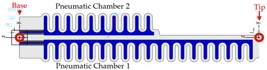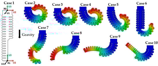 The base end of the soft robot in Figure 4 was fixed, and the tip end of the soft robot was free for finite element analysis (FEA). The two pneumatic chambers of the soft robot produce planar bending if they are pressurized. They were subjected to various loading cases, as detailed in Table 2. In total, there were 41 loading cases implemented in FEA. Table 2 only shows selected loading cases as representative examples. The loading values were determined through an iterative design process. The maximum pressure inputs for the shorter and longer chambers were 600 kPa and 700 kPa, respectively. In Table 2, the value of P is 600 kPa, which represents the maximum pressure the shorter chamber can handle without causing issues with simulation convergence or excessive self-contact.