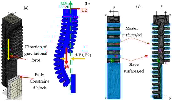 Self-contact within the actuator body was managed by defining master and slave surfaces along with the corresponding edges of the bellow (see Figure 5c). As both the master and slave surfaces are parts of the same body, they exhibit identical material properties.