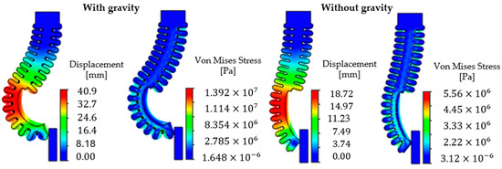 Figure 6 shows the effects of gravity on the soft robot displacement and stress. The magnitude of the soft robot displacement (40.9 mm) with gravity was nearly double that of the displacement (18.72 mm) without gravity. The maximum von Mises stress of the soft robot was 13.92 MPa with gravity and 5.56 MPa without gravity. The increased displacement and stress values under gravity are primarily due to the moment. Because the tip (surface) only has translational degrees of freedom along U1 and U3, this results in additional loading. The combined effects of pressure, gravitational loading, and reaction forces lead to higher displacement and stress within the system. Gravity significantly impacts both the displacement and stress of the soft robot. Therefore, this study employed gravity in all the finite element simulation experiments.