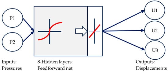 The simulation experiments for FEA involved varying pressure inputs applied to the soft robot to produce 20,362 displacement responses of the soft robot tip. We then fed these data records into a neural network (NN) for machine learning. Each data record comprises two pressure inputs of the soft robot and three displacement coordinates of the soft robot tip relative to the reference frame R1. To enhance the robustness of machine learning, a Gaussian noise of 0.1% has been added to data records. Machine learning used 40,724 data records with 80% for training and 20% for validation and testing.
