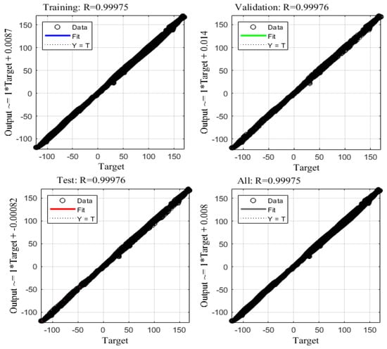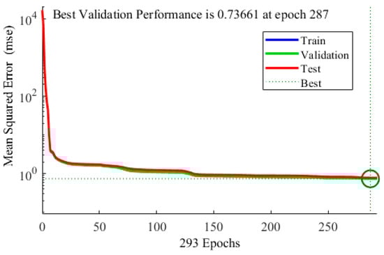 Figure 7 portrays the NN architecture. The NN for machine learning consists of two input layer nodes as the two pressure inputs of the soft robot, eight hidden layer nodes, and three output layer nodes as the three displacement coordinates of the soft robot tip. The number of hidden layer nodes was determined by optimizing the balance between computational cost and accuracy. The NN training utilized an adaptive moment estimation algorithm with the root mean square error (RMSE) loss function to expedite convergence and efficacy. The training produced very promising results, as shown in Figure 8, with a very low mean square error of 0.7366 after 287 training epochs on the validation data. Figure 9 depicts the regression plots of neural network accuracy on training, validation, and test datasets with R-squared values greater than 0.99. The trained NN was expected to serve as a forward kinematic function that takes the pressure inputs of the soft robot and produces the displacement coordinates of the soft robot tip. The generative ability of the trained NN was expected to estimate the reachable workspace of the soft robot tip with less computational efforts.