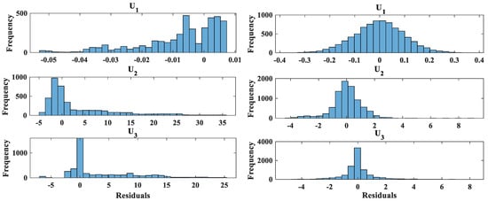 The root mean squared error (RMSE) and the mean absolute error (MAE) are 0.783 and 0.5044, respectively. The mean squared error (MSE) for the test data is 0.84726, while the MSE for the pure data is 38.7858. The results of residual analysis are shown in Figure 10. The prediction error for U1 is relatively low compared to that for U2 and U3. The errors for U2 and U3 are positively skewed, but they are generally not significant. Figure 10 (left) displays the residuals for displacement responses without noise, while Figure 10 (right) shows the residuals with 0.1% Gaussian noise. The residuals without noise exhibit greater variability than those with noise. Specifically, the noise-free residuals for U2 and U3 range from −5 to 35 mm and from −8 to 25 mm, respectively, whereas the noise-corrupted residuals range from −4 to 0.4 mm for U2 and from −6 to 8 mm for U3. The introduction of noise improved the input data for the neural network, resulting in more symmetrical residuals and a reduction in the magnitude of residuals. This enhancement contributes to the robustness of the predictions within the operating range of the soft robot.