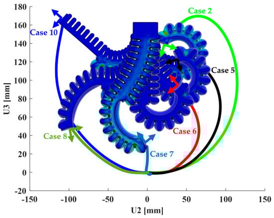 The base reference frame of the soft robot is R0, which is fixed at the base of the soft robot. The tip reference frame is R1, which is also fixed at the tip location of the soft robot when it has no pressure inputs, as shown in Case 1 of Figure 11. The x, y, and z axes of these reference frames are U1, U2, and U3, respectively. We determined the spatial displacements of the soft robot tip relative to R1. The motion of the soft robot tip was supposed to be planar and constrained to the U2–U3 plane of R1. However, due to nonlinear properties of the soft robot, there were slight displacements within +/−0.1 mm observed along the U1 axis of R1. Figure 12 illustrates the paths of the soft robot tip relative to R1 for the loading cases in Table 2. When the Chamber-2 pressure dominates, bending occurs in a clockwise direction, e.g., Case 7, Case 8, and Case 10. In contrast, if the Chamber-1 pressure dominates, bending occurs in a counterclockwise direction, e.g., Case 2, Case 5, and Case 6.