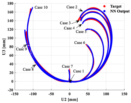 The simulation experiments for FEA involved varying pressure inputs applied to the soft robot to produce 20,362 displacement responses of the soft robot tip. We then fed those data into a neural network (NN) for machine learning as explained in Section 3.2. Figure 13 illustrates the soft robot tip paths estimated by the trained NN for the loading cases in Table 2. The NN accuracy was very promising with an R-squared value of 0.99.