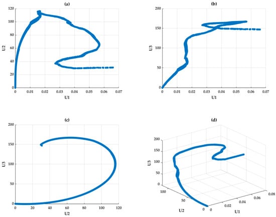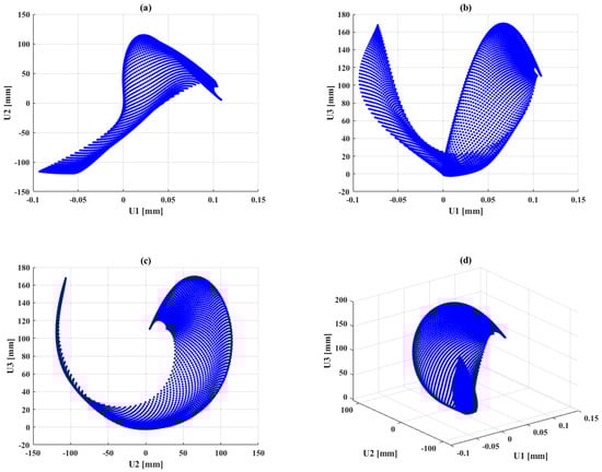 A soft robot with a single chamber (only Chamber 1) was analyzed, while maintaining the same constraints and loads as used for the asymmetric double-chamber soft robot. This robot was subjected to a maximum load of 700 kPa, and the displacement response was obtained by tracking the displacement of the tip of the actuator. Figure 15 illustrates the displacement values at the tip of the robot as it bends due to pressure. A small displacement along the U1 direction is shown in Figure 15a,b. The side view in Figure 15c demonstrates that there is no negative displacement along the U2 direction, unlike the asymmetric double-chamber soft robot workspace (see Figure 14c). Additionally, the workspace appears as a line rather than a large area, which contrasts with that of the asymmetric double-chamber soft robot. The results are also in close agreement with the asymmetric robot in Load Case 2, as listed in Table 2.