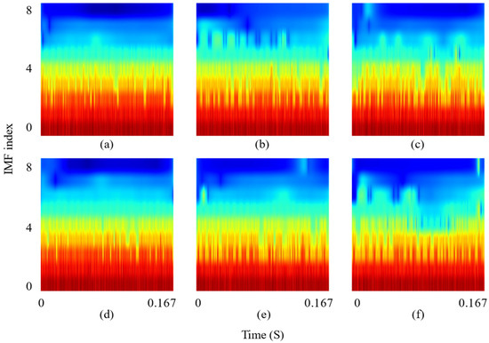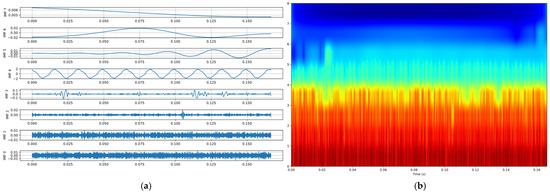 Figure 1a shows all the IMFs generated by a current signal after EMD, and Figure 1b is the HHT spectrum generated by IMF after Hilbert transform. The horizontal axis represents time (from 0 to 0.167 s), and the vertical axis represents the IMF index (from 0 to 8), where lower indexes correspond to high-frequency components and higher indexes correspond to low-frequency components. The color intensity follows the logarithmic frequency distribution law, representing the instantaneous frequency corresponding to the horizontal axis time, red for high frequency and blue for low frequency. This color distribution pattern can better highlight the fault characteristic frequencies with smaller amplitudes.