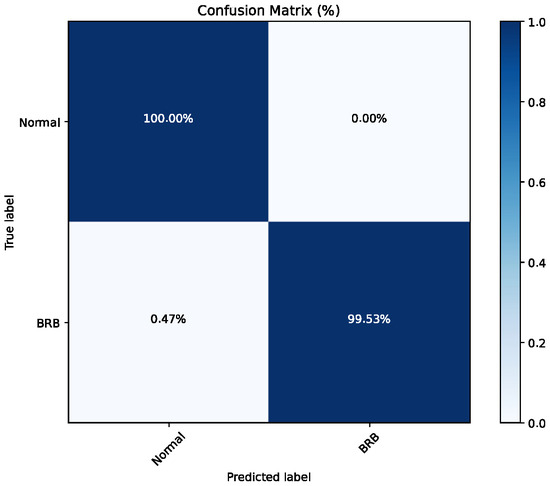 Table 2 illustrates the fault detection accuracy for each of the 20 operating conditions. The results show that the model has about 3–5% incorrect prediction labels for motors with one BRB at 25% and 50% loads, mainly because the current fault characteristics of motors with smaller faults at lighter loads are not obvious enough. Except for this, the prediction accuracy for the other working states reaches 100%. In general, it can be considered that the accuracy of the model remains high under the condition of weak characteristics.
