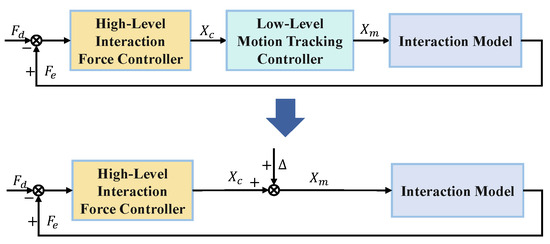 Currently, the widely studied and employed interaction force control framework comprises two coupled components: force modulation in the high-level loop and position tracking in the low-level loop, as illustrated in Figure 2. The commands generated by the force controller in the high-level loop are transmitted to the lower-level motion controller to achieve the desired interaction behavior. This indicates that the accuracy of the low-level motion tracking controller significantly affects the performance of the interaction force control. For the sake of simplicity, all the existing studies typically assume that the low-level motion controller can perfectly track the commanded trajectory, i.e., [10,15,20]. However, motion tracking errors always exist in the low-level loop in practice, which significantly hinders the achievement of accurate force control [25,26] and can be formulated as an unknown input disturbance of the high-level force control.