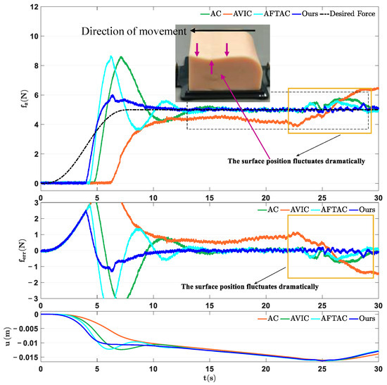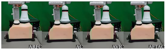 Figure 10 reports the experimental results for this case. It is evident that the AC does not work well in this scene due to the unknown and variable position and stiffness of the surface. In comparison, the AVIC and AFTAC exhibit a certain degree of robustness and can maintain accurate force tracking under moderate uncertainties. However, when confronted with a challenging environment, such as passing through the gully feature area of the medical phantom (starting from approximately 22 s in Figure 10), the limitations of the traditional impedance/admittance-based methods are brought out. This is primarily due to the impact of structured uncertainties, arising from unknown environmental parameters, as well as unstructured uncertainties, such as modeling errors. As a result, the system fails to achieve stable force tracking performance. In contrast, the dynamic equation presented in Equation (3) comprehensively accounts for both structured and unstructured uncertainties. By employing adaptive robust control and ESO techniques to compensate for and attenuate different disturbances, the robustness of the system is significantly enhanced.