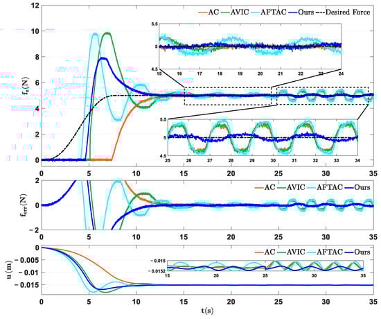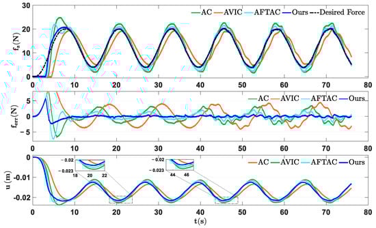 where s. The experimental results are presented in Figure 8. It clearly illustrates that when the end-effector of the manipulator makes contact with the surface, the AFTAC and AVIC converge towards the desired contact force with significant overshoots driven by the force tracking error. In addition, due to the limitation of the adaptive mechanism in AVIC, there exists manifest force tracking errors at both peaks and valleys. As for the conventional AC, it gradually converges to the desired contact force with a noticeable delay once the contact is established. This delay occurs because AC regulates the motion of the robot solely based on force feedback, without employing other estimation or compensation techniques, resulting in a slower response. In contrast, the proposed approach shows significant superiority in the sense of both suppressing transient overshoots and accurate steady-state dynamic force tracking. In addition, similar to Case 1, once stable contact is established and maintained for a period of time, a deviation is introduced to the original command of the low-level motion controller from 40 s to evaluate the robustness of the proposed controller. To provide a more detailed evaluation of the effectiveness of the proposed method, a statistical analysis is conducted by quantifying the root mean square error (RMSE) and the maximum value of the steady-state force tracking errors before and after the deviation is injected within the time range of 10–75 s. As shown in Table 2, in terms of RMSE, the proposed ARFC achieves reduction of , , and compared to AC, AVIC, and AFTAC, respectively.