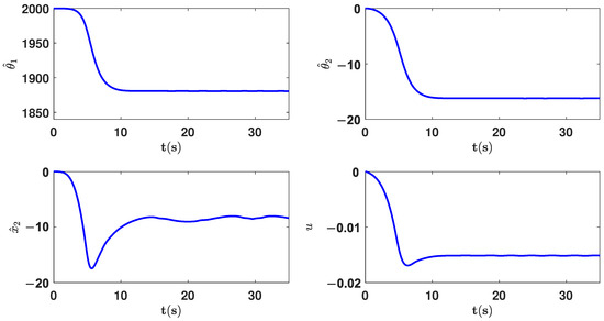 Fortunately, it has been demonstrated that the ESO possesses the capability to estimate disturbances with specified estimation errors [30,31]. A promising approach integrating adaptive laws with the ESO is used to address various uncertainties present within the system. Specifically, structured uncertainties are mitigated through parameter adaptation, while the majority of unstructured uncertainties are estimated by the ESO and subsequently compensated for via feedforward. This parameter adaptation process effectively reduces most parametric uncertainties, thereby alleviating the burden on the ESO. Furthermore, the integration of the ESO allows for a reduction of unstructured uncertainties in the dynamic Equation (4), potentially enhancing the convergence of parameter estimation.
