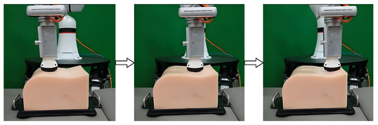 In this subsection, we evaluate the performance of the robot in force regulation as it moves along a predetermined path. The ultrasonic probe mounted at the end of the manipulator is required to slide along the uneven surface of a 3D human abdominal medical phantom while maintaining a constant desired interaction force as demonstrated in Figure 9. This experimental configuration effectively simulates the essential processes involved in robotic ultrasound scanning.