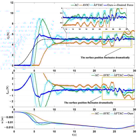 In this instance, we further review the robustness of the proposed method by applying a deviation to the original command of the low-level motion controller during the process of the robot sliding along a specified path while maintaining a constant contact force. The experimental results are illustrated in Figure 11. The deviation is introduced from 15 s, resulting in fluctuations in the actual contact forces of AC, AVIC, and AFTAC around the steady-state contact force. Notably, these fluctuations are exacerbated by varying uncertainties, such as the robot sliding along an inclined surface during the 15–22 s time period. Additionally, the force tracking performance deteriorates when passing across gully-liked surfaces. Conversely, the proposed approach achieves precise force tracking performance throughout the process and can rapidly adjust and converge to the desired contact force even in challenging environments (see 24–30 s when passing through the gully-like surface).