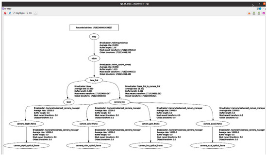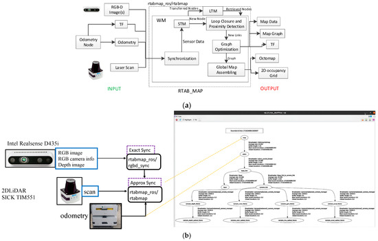 RTAB-MAP is the construction of SLAM and real-time environment mapping and localization. The method is suitable for navigation robot applications. The RTAB-MAP mapping process begins with the systematic collection of data from the RGB-D camera and the 2D LiDAR, followed by pre-processing to filter and synchronize the data from different sensors. The characteristics are then extracted from the data and matched, and the pose of the robot is estimated. If loops are detected, the map will be optimized to reduce the accumulated error. The optimized attitude and sensor data are used to generate high-precision 3D maps. After extracting and matching the features from the data, the attitude of the AMR is estimated and the navigation target is set for path planning and obstacle avoidance. Then, the positioning is updated in real time during navigation to improve the positioning accuracy. The ROS provides the precise synchronization and approximate synchronization. RTAB-MAP mainly uses the approximate synchronization method to synchronize the top publishing speed of multiple sensors with minimal latency error. We used rtabmap_ros/rgbd_sync to synchronize the RGB-D camera’s RGB and the depth image data into a single subject rtabmap_ros/RGBD image. Then, rgbd_sync approximated synchronization and rgbd_sync was used to synchronize data with different sensors to improve the overall performance and stability, as shown in Figure 2b.
