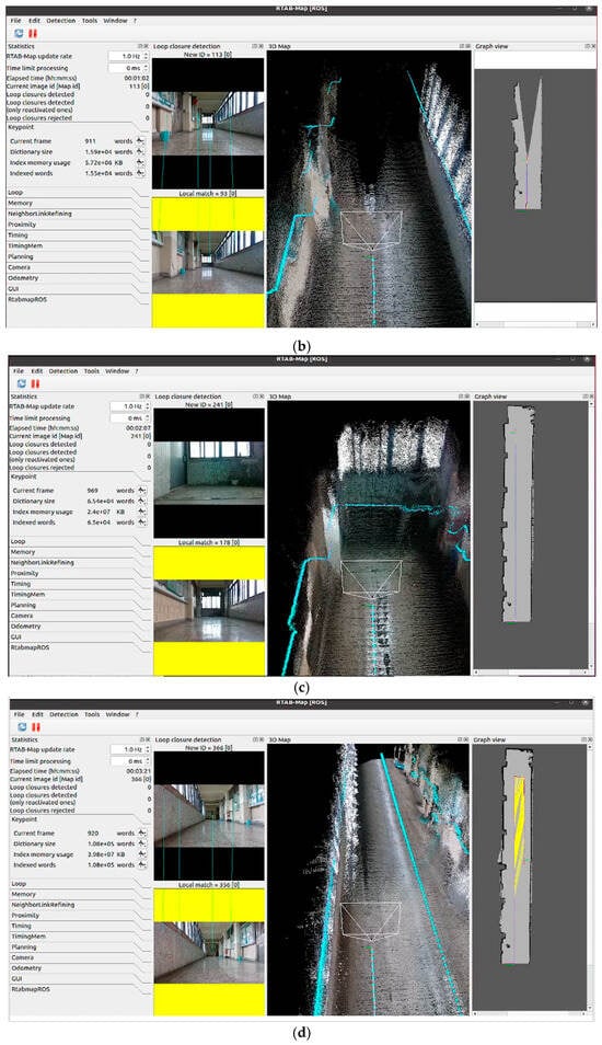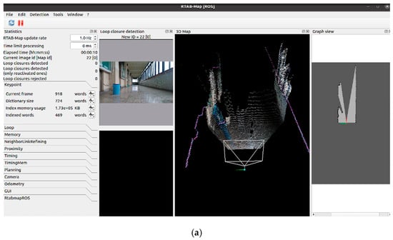RTAB-MAP (Real-Time Appearance-Based Mapping) is a mapping algorithm that combines SLAM features with appearance-based mapping [21]. It is designed for real-time 3D modeling in dynamic environments and has the ability to adapt to fast-changing environments [22]. RTAB-MAP can be used to implement either a visual SLAM approach or a LiDAR SLAM approach on a real robot. It can be used to create 2D or 3D maps by using an RGB-D camera or a LiDAR to estimate its position and orientation in the map simultaneously [23,24]. Therefore, multi-sensor fusion SLAM techniques can be utilized in the robotic system to collect LiDAR data and perform RGB-D reconstructions [25]. RTAB-MAP includes important features such as stereo image matching and depth image matching. It can be integrated with an ROS (Robot Operating System) on various robotic platforms. Many studies optimize the performance of RTAB-MAP in real-time 3D mapping, including the use of loop closure techniques [26]. Loop closure is an important process that detects whether an AMR has returned to a previously visited location and connects the separated parts of the map into a unified whole. It is very important because loop closure can produce accurate maps. Three-dimensional loop closure is the process of detecting the 3D map created by the system to identify previously visited locations [27].