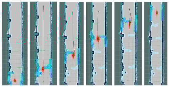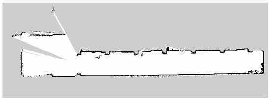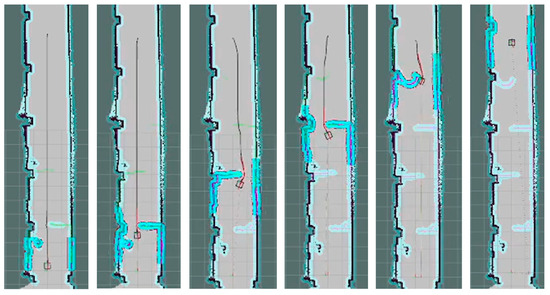In this paper, the A* global path planning feasible moving path and dynamic window approach (DWA) are used for regional path planning, and the navigation is completed by receiving the control speed command. Relevant research on large-scale 3D map navigation can be found in [43]. In this paper, adaptive Monte Carlo positioning (AMCL) and RTAB-MAP positioning were used to test the positioning accuracy for the long corridor obstacle avoidance scene, as shown in Figure 11. The AMCL method and RTAB-MAP employ different sensor modalities to estimate their respective locations. The experimental results reveal distinct characteristics of the two SLAM methods tested. The AMCL only uses odometry, IMU, and LiDAR data to estimate the AMR’s locations. However, RTAB-MAP utilizes odometry, IMU, RGB-D, and LiDAR information to estimate the locations. Figure 12 illustrates the localization results for the AMCL method based on the TORO method. The AMCL method adopts SLAM techniques along the navigated path and can continuously localize the system with different levels of success when applied to the data collected. RTAB-MAP based on the TORO method is shown in Figure 13. RTAB-MAP uses visual features for loop closure, while the AMCL is supported by LiDAR-based loop closure. Both approaches successfully identify loop closures along the path. It can be observed that both methods can localize the AMR system with different levels of success when applied to the data collected. Figure 14 shows the actual navigation results for the proposed RTAB-MAP with TORO. The results show that the approach successfully identifies the loop closures along the path and it can localize the AMR system with the data collected.