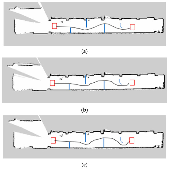 (a) Obstacle avoidance and loop closure detection; (b) beginning of the task; (c) destination of the obstacle avoidance task.