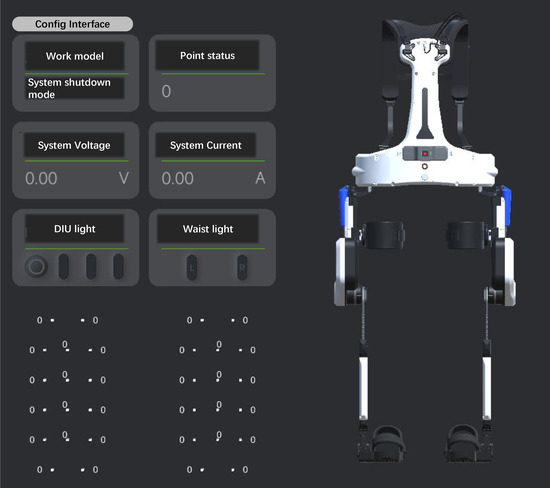At the bottom of the Config interface, there are 16 small white blocks on each side representing the foot pressure sensors for the robot’s left and right feet, and the pressure values next to the points will change according to the variations in pressure, as show in Figure 2. On the right side of the Config interface, you can select the lengths of the thigh and calf, and the model’s leg length will adjust accordingly.