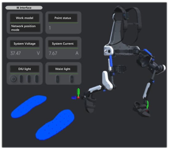 The left and right sides of the IK interface display real-time data related to the robot. When the robot’s mode is set to joint network position mode, dragging the arrows on both sides of the bottom of the 3D robot model will cause the model’s hip and knee joints (MCD) to move in accordance with the arrow positions, as shown in Figure 3 and Figure 4. At the same time, the positions of the model’s hip and knee joints will be sent to the robot in real time, causing the robot to move in alignment with the model’s movement, thereby maintaining consistency between the robot and the 3D model on the IK interface.