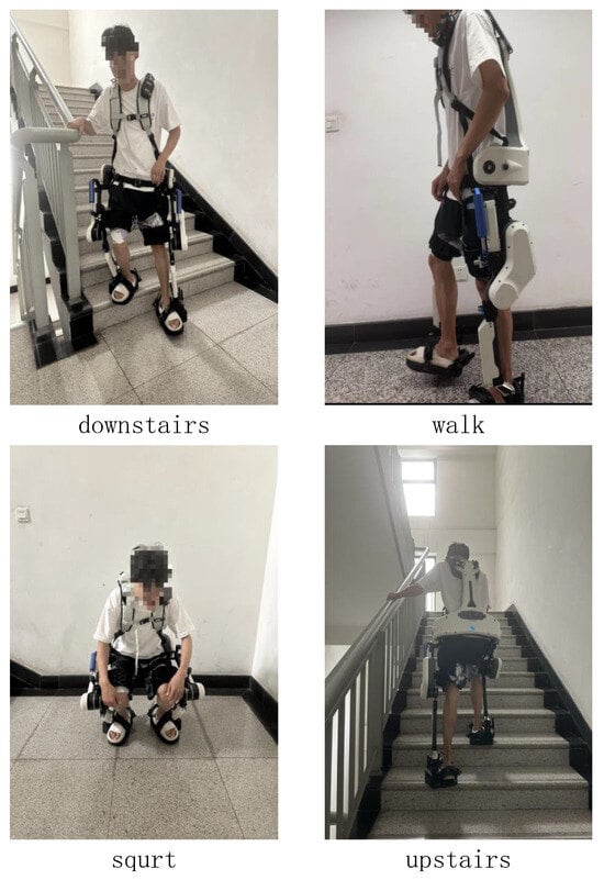 Before the data acquisition experiment, two subjects were allowed to wear the device for a period of adaptive exercise to collect more accurate data. These two subjects have different physiological characteristics, as shown in Table 1. The gait sensor signals include four patterns: standing still, walking on flat ground, walking up and down stairs, traveling up and down slopes, and squatting and standing. To relieve muscle fatigue, the operators took a 5 min break after each experiment. The experiments are shown in Figure 5 and the partly collected data are shown in Figure 6.