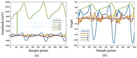 Some abnormal disturbance was found in the original MCD signal, which had to be filtered such that the abnormal data were replaced by the mean value or the previous moment value. Of note, the original angle and angular velocity data needed to be processed from the voltage signal to a real physical value, which is shown in Figure 8.