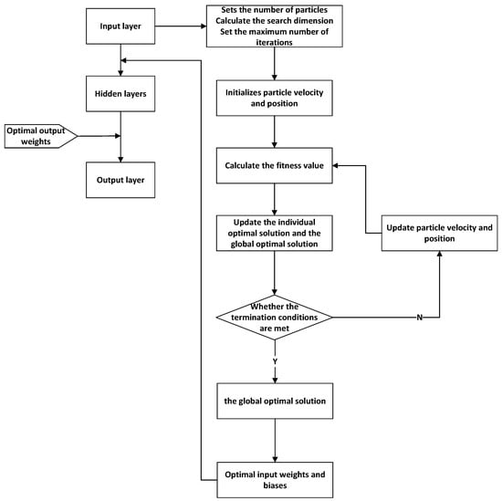 To improve the robustness of ELM (Extreme Learning Machine) recognition, the PSO (Particle Swarm Optimization) algorithm was used to optimize the input weights W and input biases B in the ELM module. This led to the development of the Particle Swarm Optimization-based Extreme Learning Machine (PSO-ELM) classification algorithm, which aims to find the optimal result. The specific process is shown in Figure 10.