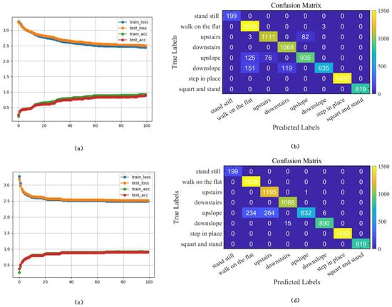 The training process and results of the FNN and the LSTM models of Subject 1: (a) the training process of the FNN; (b) the confusion matrix of the FNN; (c) the training process of the LSTM model; (d) the confusion matrix of the LSTM model.