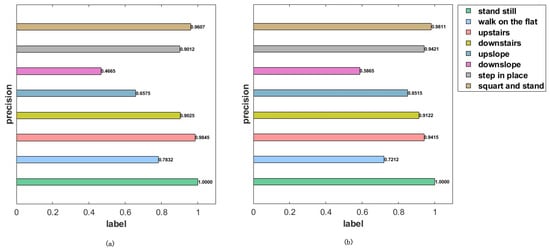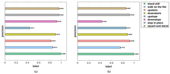 The recognition precision for each gait phase of Subject 1: (a) the FNN; (b) the LSTM model.