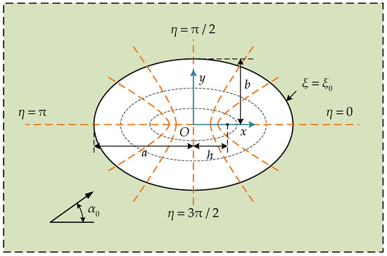 An elliptic cylindrical coordinate system (ξ, η, z) is established in an infinite piezoelectric material, in which ξ and η are variables of the curvilinear coordinates [26,27]. The origin O is located at the center of the ellipse, as shown in Figure 1. The direction of z, perpendicular to the paper and facing outward, represents the direction of polarization. The elliptic opening has a long axis length of 2a, which is aligned with the x-axis, and a short axis length of 2b, which is aligned with the y-axis. The focal length is 2h, and the plane SH wave is incident at an angle α0.
