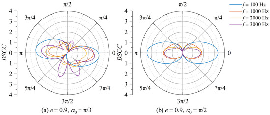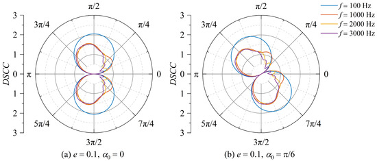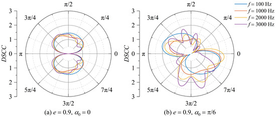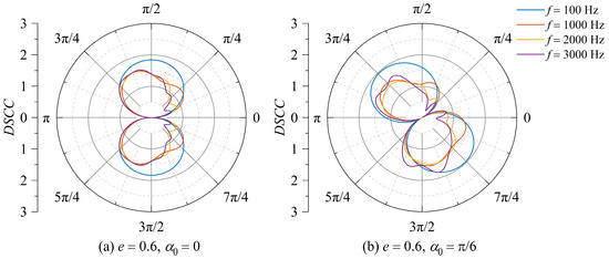Distribution of DSCC around the elliptical opening with an eccentricity of e = 0.6. (a) Incident angle α0 = 0; (b) incident angle α0 = π/6.