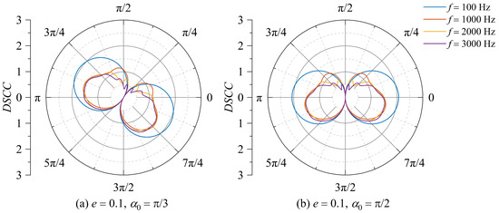 Figure 6 and Figure 7 illustrate the size and distribution of DSCC around the elliptical opening under different incident angles α0 and the variation of incident frequency f when the eccentricity is e = 0.9. In the numerical example, the short semi-axis of the elliptical opening is 56.2% shorter than that of the elliptical opening with an eccentricity of e = 0.1. The DSCC distribution around the elliptical opening undergoes significant changes. Particularly, when the incident wave is obliquely incident (α0 = π/6, α0 = π/3), the DSCC distribution exhibits a decrease followed by an increase with the change in frequency. This is evident in Figure 6a and Figure 7b, where the extreme DSCC values for the SH wave incident along the long axis and short axis are 1.45 and 3.40, respectively. Therefore, special attention should be given to the potential damage in the low-frequency vibration environment for piezoelectric materials with elliptical openings of large eccentricity.
