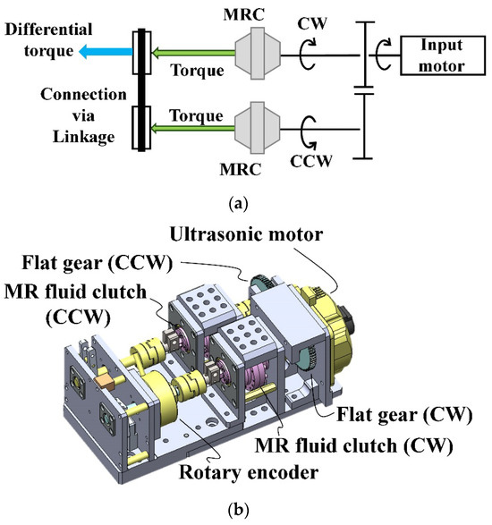 Figure 2 illustrates the torque flow (a) and mechanical structure (b) of TD-MRA. In this system, an input motor generates a driving torque in only one direction (for example, CW) at a constant speed, while a pair of gears generates torques in both the clockwise (CW) and counterclockwise (CCW) directions. The compact MRF clutch for haptics (H-MRC) transmits torque precisely in each direction. The CW and CCW torque are combined using linkage or belt mechanisms, and the differential torque is delivered as output.