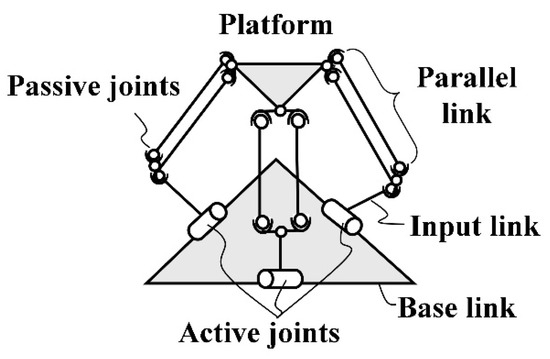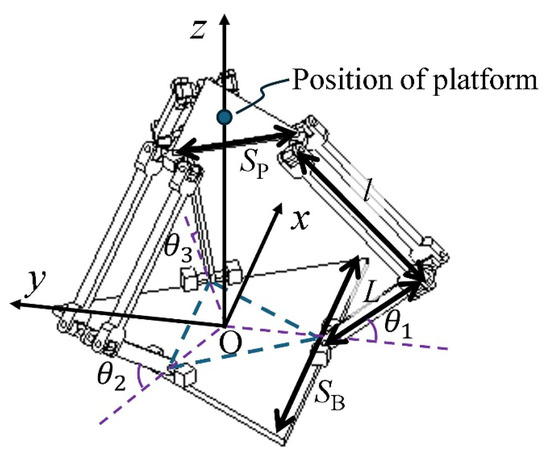 Figure 4 defines the design parameters and the coordinate system of the device. θ1–θ3 represent the rotational input of the delta mechanism, which corresponds to the output rotations of TD-MRAs. The lengths of the base link, platform, and input and parallel links are denoted as , , , and , respectively. The Jacobian Matrix, , of this mechanism is summarized as follows by considering its kinematics [17],