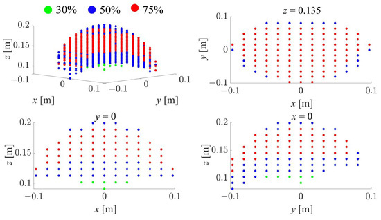 Based on the analysis, we set mm, mm, mm, and mm. Figure 5 shows the analysis results, where the red, blue, and green points represent regions that are more than 75%, 50%, and 30% of the maximum operability, respectively. According to the design of the linkage system, the range of motion in a cylindrical area of 80 mm in radius and 100 mm in height was supported by more than 50% operability.