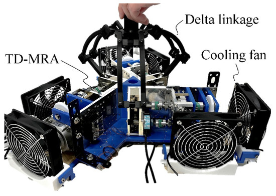 There are diverse examples of haptic device mechanisms. Serial link mechanisms are widely used in commercially available remotely controlled surgical robots [14] due to their broad range of motion. Conversely, parallel link mechanisms are utilized in surgical robots [15] and in commonly used haptic devices [16]. Despite their narrower range of motion, the high rigidity, position control accuracy, and low inertia of the output link make them suitable for high-performance haptic devices. The delta link mechanism [17,18] is a parallel link mechanism whose degrees of freedom (DOF) facilitate translational movements in three directions. The delta link mechanism is driven by three rotational inputs, making it compatible with rotational actuators such as the TD-MRA.