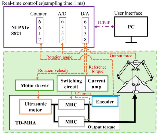 A six-axis force–moment sensor (PFS055YA251G6, Leptrino, Nagano, Japan) was mounted on an aluminum frame and attached to the platform of the device. Figure 7 illustrates the signal flow of the measurement system. A personal computer was the main controller, and an NI PXIe-8821 (National Instruments, Austin, TX, USA) was used as the real-time controller. The devices communicated via local area network cables, and the sampling time of the NI PXIe-8821 was 1 ms. The D/A board (NI PXIe-6738, National Instruments, Austin, TX, USA) was inserted into the NI PXIe-8821 to output command values for controlling the ultrasonic motor and clutches. The force of the device was measured in real-time using the force-moment sensor. An A/D board (NI PXIe-6355, National Instruments, Austin, TX, USA) was also connected to the NI PXIe-8821 to read the output signal from the force-moment sensor, thereby measuring the output performance of the device.