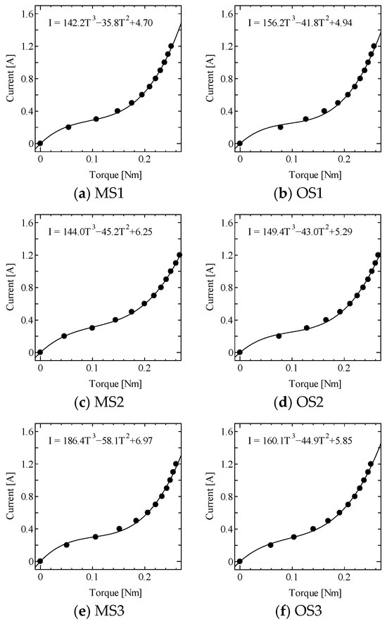Three sets of TD-MRAs, No. 1–3, were used as torque drivers for the active joints of the delta link system. Each TD-MRA included two MRCs as torque transmitters on the motor-side (MS) and opposite-side (OS). To design the open-loop controller, the relationships between the input current and output torque for all the MRCs in the haptic device were preliminarily measured. Figure 8 shows the measurement results, where “MS1” indicates the motor-side MRC in No.1 TD-MRA. In the figures, the horizontal and vertical axes represent the current input and output torque, respectively. Third-order regression functions were calculated using the least mean square method. Each curve in these figures denotes the model curve, where “T” and “I” indicate the output torque and input current. These functions were used in the open-loop force controller of haptic devices.