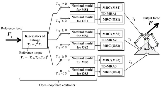 Figure 9 shows the block diagram of the open-loop force controller. In the controller, the required 3D force vector () was first transformed into a torque vector (), whose three components (, , and ) were the output torques of the three TD-MRAs. The transposed matrix of the Jacobian Matrix (Equation (2)) was used as the transformation matrix. Furthermore, the required output torques were transformed into the corresponding input currents using the nominal models shown in Figure 8.
