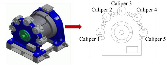 Elevators rely on the elevator braking system from running to stopping or emergency stopping, so the elevator braking system is the core component to ensure the safe operation of elevators [19,20]. As the actuator used in most high-speed elevator braking processes, the multi-clamp disc brake is an important component for ensuring the safety of elevators, and its braking performance is directly related to the reliable braking and stopping of the traction machine and the safe stopping of the car. As shown in Figure 1, a multi-clamp disc elevator brake usually consists of multiple brake calipers and brake discs, which can apply braking torque at multiple contact points at the same time to form a large braking torque in a short period of time and to improve the emergency braking effect of the elevator.