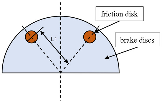 The basic brake mechanism of a multi-caliper disc brake is shown in Figure 2. The brake can be configured in multiple pairs to increase the braking torque. Usually, the size of the friction pads of this type of brake is much smaller compared with the size of the brake disc, so when calculating the braking torque, the distance between the center of gravity of the friction pads and the center of rotation of the brake disc can be taken into account as the braking force arm. The calculation for the braking torque of a single caliper is shown below: