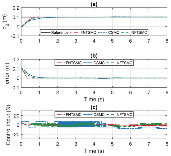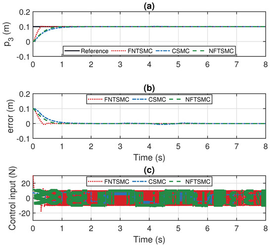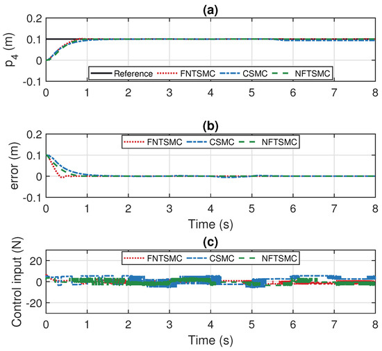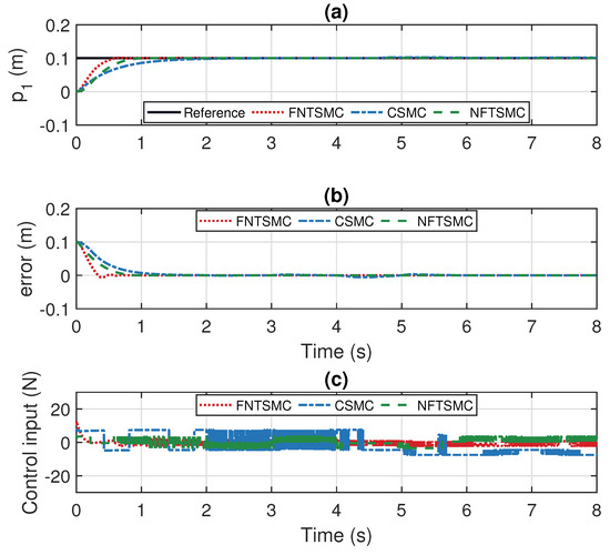 In the simulation, the parameters were selected based on a combination of experimental trials and optimization algorithms. The parameters of FNTSMC are chosen as: , , , , , , , , ; the parameters of CSMC are chosen as: , ; the parameters of NFTSMC are chosen as: , , , , , . These parameters were determined through a series of simulations and validated for optimal performance.
