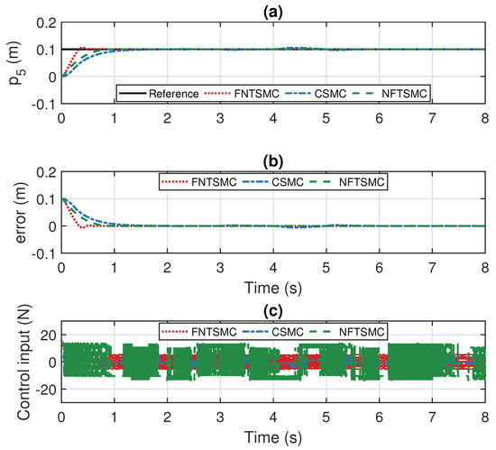 Figure 3c, Figure 4c, Figure 5c, Figure 6c and Figure 7c represent the control inputs of the five linear motors for CSMC, NFTSMC, and FNTSMC, respectively. Comparison of the figures reveals that the output amplitudes of the three controllers remain largely synchronized. However, CSMC and NFTSMC fail to converge completely when the linear motor fails; thus, it is found that CSMC and NFTSMC have some limitations in fault-tolerant control due to their robustness and the conflict of switching term jittering, and the method proposed in this paper has some superiority.