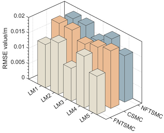 RMSE comparison of position tracking for LM1−LM5. Bars represent RMSE values under FNTSMC, CSMC, and NFTSMC.
