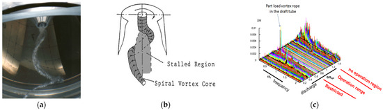 Another component of the hydraulic turbine is the draft tube, whose goal is to convert the kinetic energy from the runner outlet into potential energy. At partial load, pressure recovery is small with high hydraulic losses due to the appearance of the rope vortex that presents severe pressure fluctuations, resulting in change associated with turbine output (power swing), shown by Figure 1c [8].
