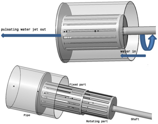The innovative device for controlling unsteadiness associated with the vortex rope from the discharge cone of hydraulic turbines operated at partial load consists of two cylindrical parts with axial slots, one fixed and one rotating, as is shown in Figure 2. The rotating part is driven with the help of a variable speed motor so that the transited water flow is fragmented due to the relative movement of the slots on the two cylindrical parts, generating a closing/opening effect of the flow path depending on the speed of rotation induced to the rotating part. The rotating speed of the motor is controlled by the voltage from an amplifier. In this way, the frequency of the water jet can be adjusted to a value that gives maximum efficiency for the annihilation of the vortex sheet that occurs when the turbine operates at the partial-flow regime. In our case, the number of slots is 16, which means that the frequency of the pulsation of the water jet will be 16 Hz for a complete rotation during a time interval of 1 s [30].