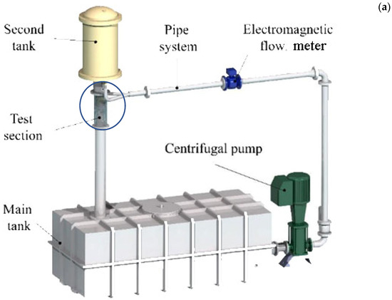 The nominal discharge was measured using an electromagnetic flow meter (Figure 3a) with an accuracy of ±0.15%. The test rig was filled with water with no air inside, resulting in a non-cavitating vortex with a constant value of the water density.