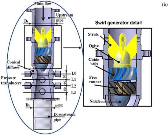The testing of the device utilized unsteady pressure field measurements on the test rig for swirling flow control within the Hydraulic Machines Laboratory from Politehnica University Timisoara. The test rig detailed in [18] according to Figure 3a has as its main component a swirl generator located inside a test section, which produces a similar flow to the one generated by a Francis turbine operated at 60–70% partial load [32]. At this operating point, pressure pulsations are the largest [33]. The components of the swirl generator are the struts, guide vanes, the runner, and the nozzle.