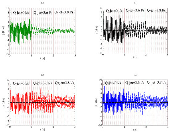 The pressure fluctuations and the corresponding fast Fourier transform (FFT) for all levels in the cases with and without a pulsating jet for Qnom = 30 l/s are shown in Figure 5. The FFT shows a decrease in frequency across all levels, from 16.4 Hz in the case without a pulsating water jet (vortex rope) to 10.5 Hz in the case with a pulsating water jet of Q-jet = 3.6 l/s (the decrease is 36%). In the same case (Q-jet = 3.6 l/s), the amplitudes have a small decrease because the vortex is well-developed. In the case of a pulsating jet with a Q-jet = 3.8 l/s, the amplitudes are mitigated or even eliminated. The outcomes presented above are plotted from the preliminary measurements.