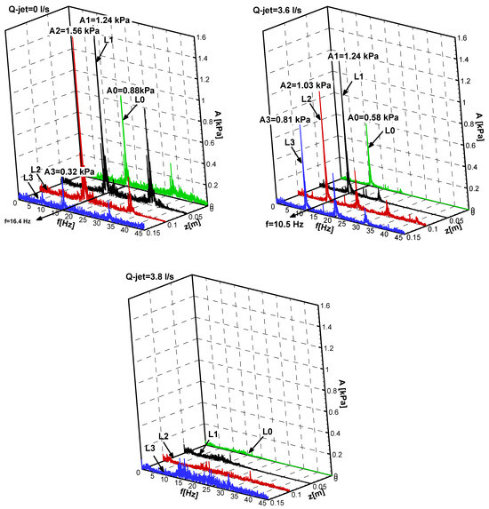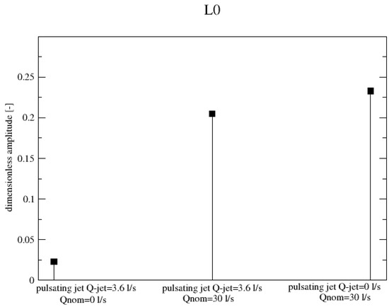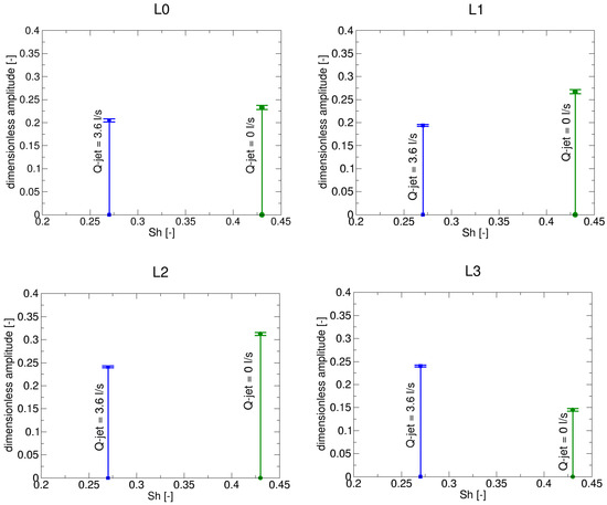 Figure 6 presents the equivalent amplitudes and Sh numbers in dimensionless form for all levels (L0–L3) that were obtained after using Parceval’s theory, both without a pulsating jet (Q-jet = 0 l/s) and with a pulsating jet (Q-jet = 3.6 l/s). According to Figure 5, Parceval’s theory is unapplicable to the case with a pulsating jet at Q-jet = 3.8 l/s due to the significant decrease in the amplitudes (up to zero). Therefore, we will focus on the case of the pulsating jet at Q-jet = 3.6 l/s. This remark is important to have a minimum pulsating jet discharge to avoid the high value of volumetric losses, considering that the water supply comes from the runner upstream.